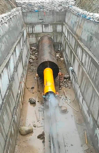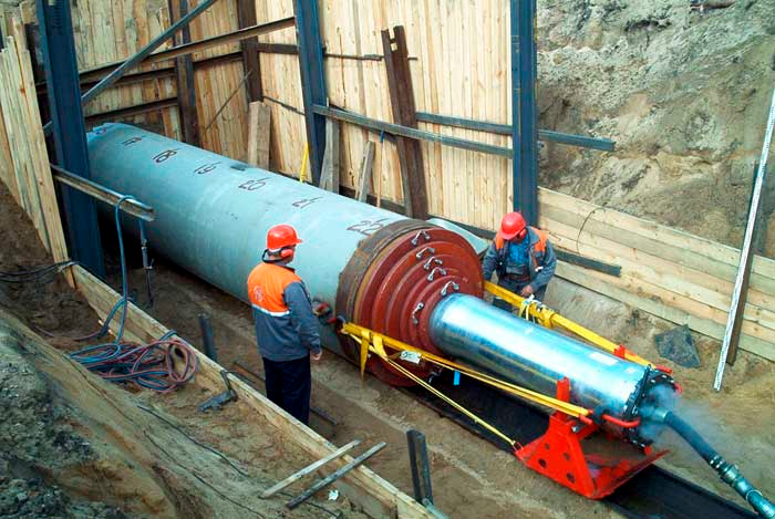 Разрыхлённый грунт попадает внутрь трубы. После того как труба достигает приемного котлована, грунтовую пробку извлекают, и прокладка трубопровода считается завершённой.